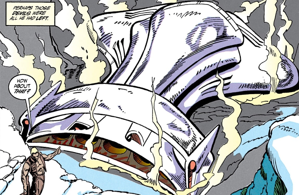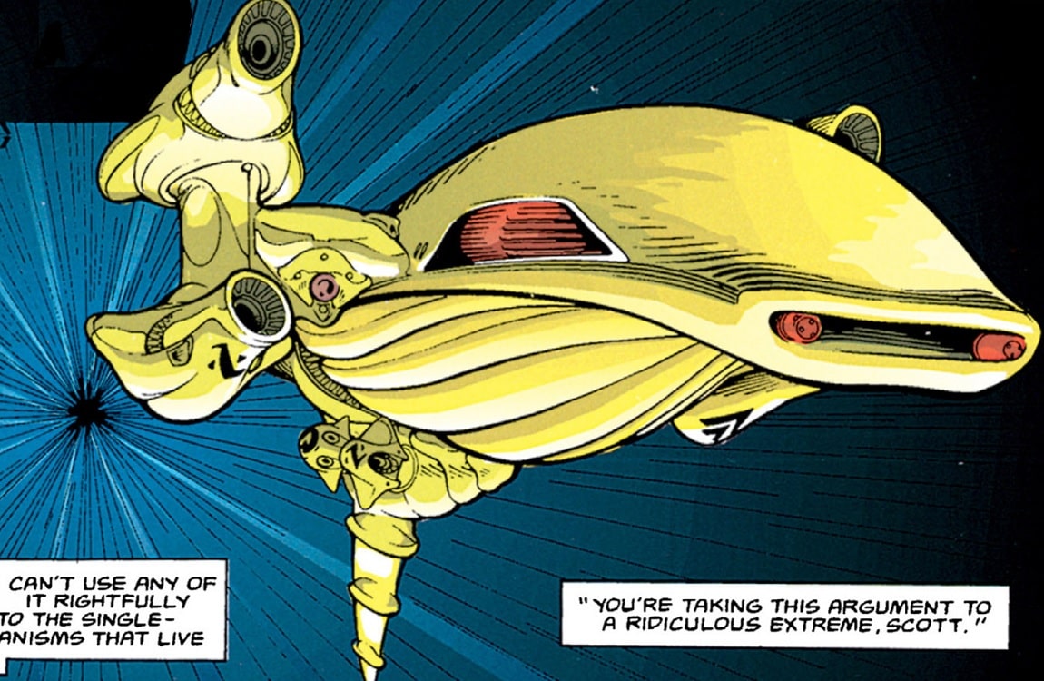The JLA vs. Predator crossover comic introduced Meta Predators, a group of hybrid Yautja who had taken over some of the abilities of JLA members. One Predator had the power of Plastic Man, and somehow this allowed him to transform into a fighter plane, chasing down the real Plastic Man (also in the shape of a plane) around Venice. It actually managed to do a good job of fast maneuvering and had powerful guns, but this was by far the most ridiculous Predator ship design by date.